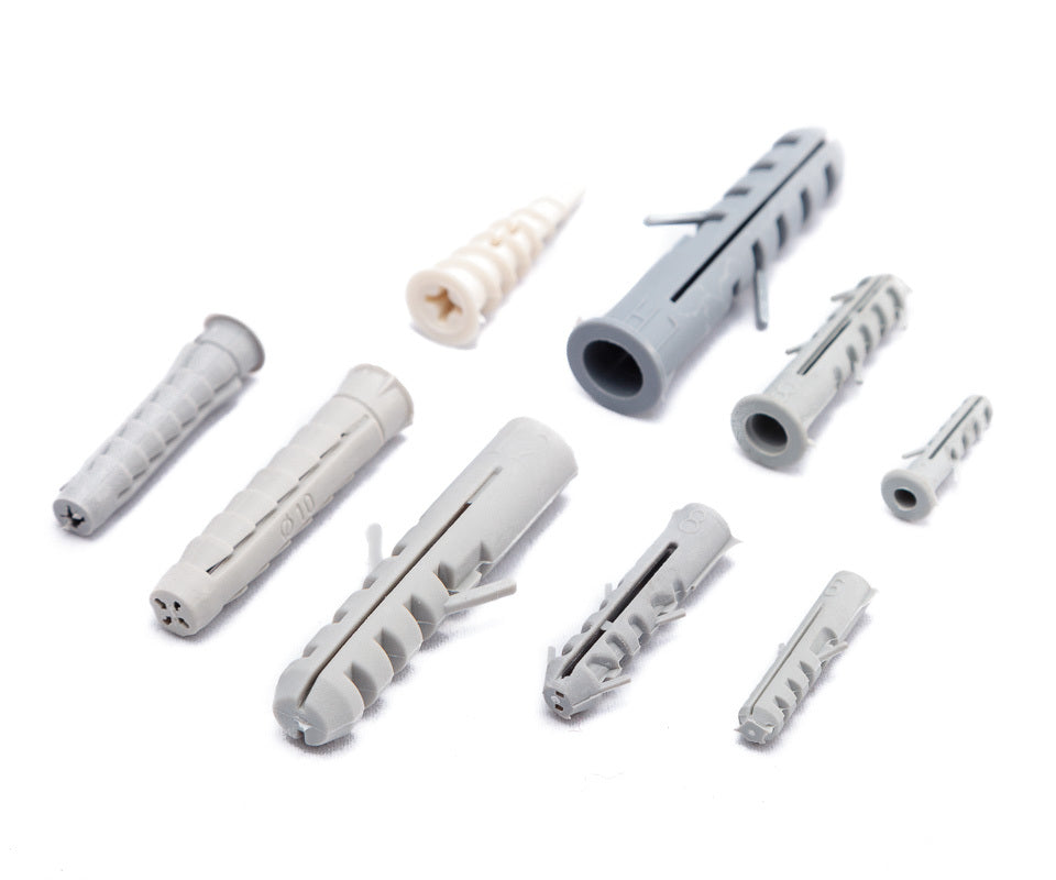 - Tacos o anclajes: Piezas insertadas en superficies como paredes para fijar tornillos o soportes.